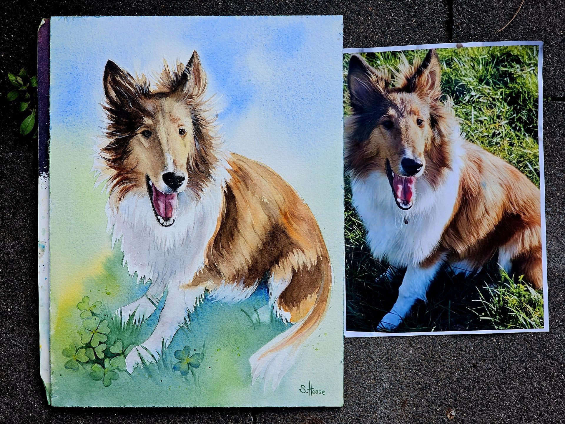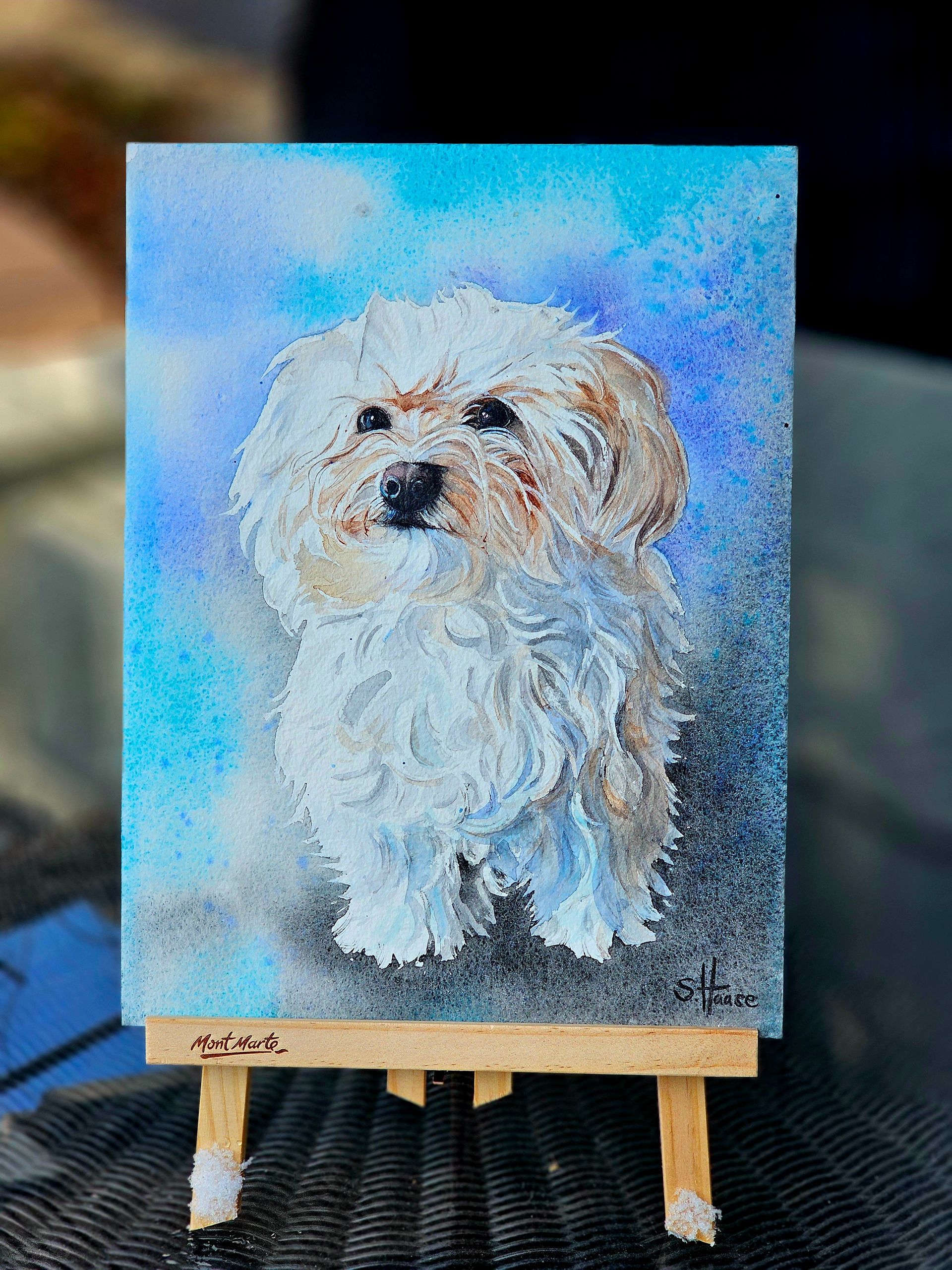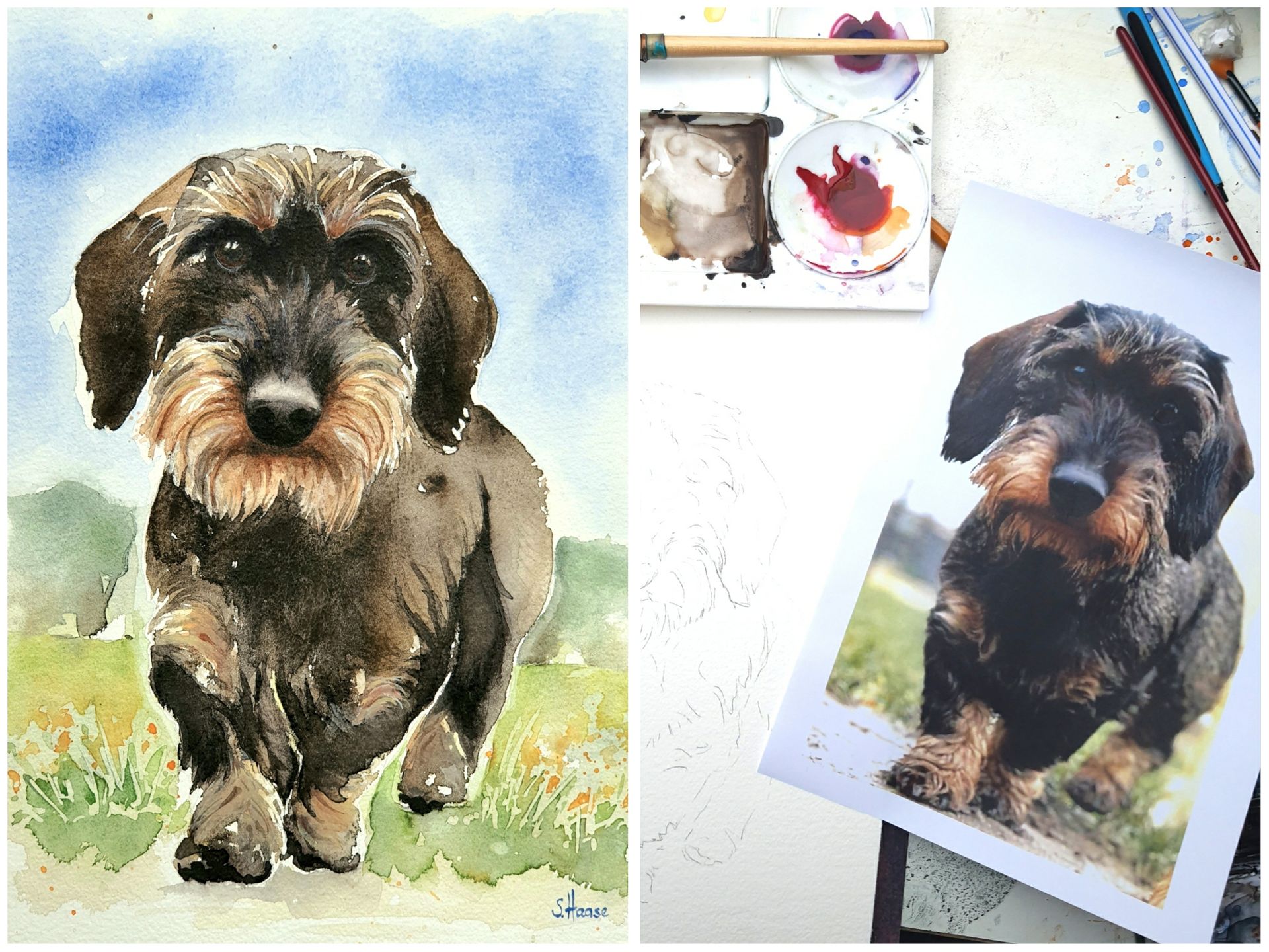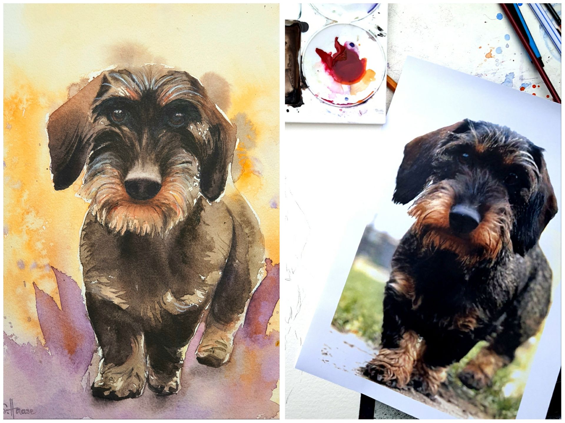 Nach den Vorstellungen des Kunden zu malen, in Gedanken bei dessen ganz besonderen Tieres zu sein und mit jedem Pinselstrich der Vollendung des Werkes näherzukommen, ist etwas ganz Besonderes und Spannendes. Die Fertigstellung eines solchen Haustieraquarelles macht mich immer besonders stolz.