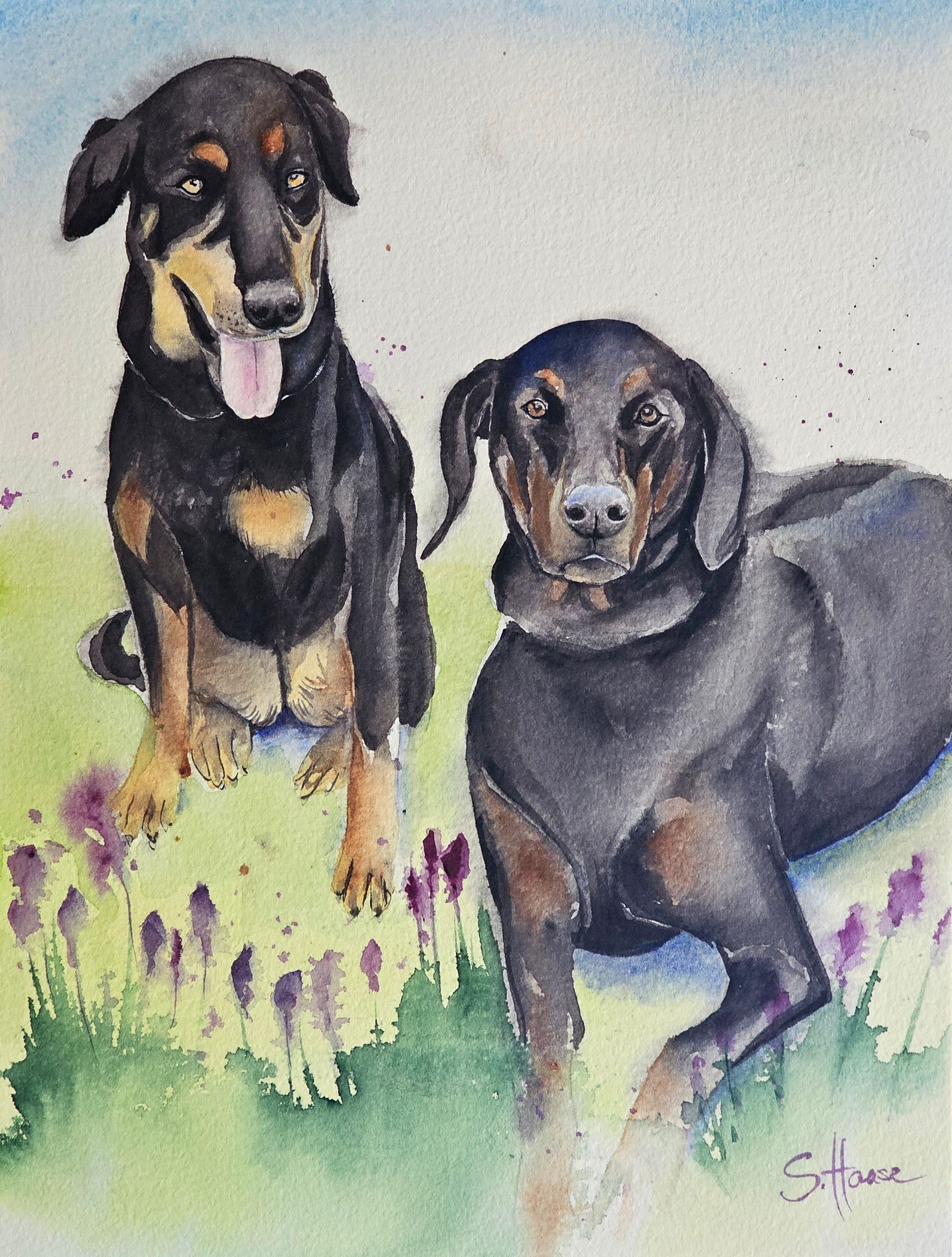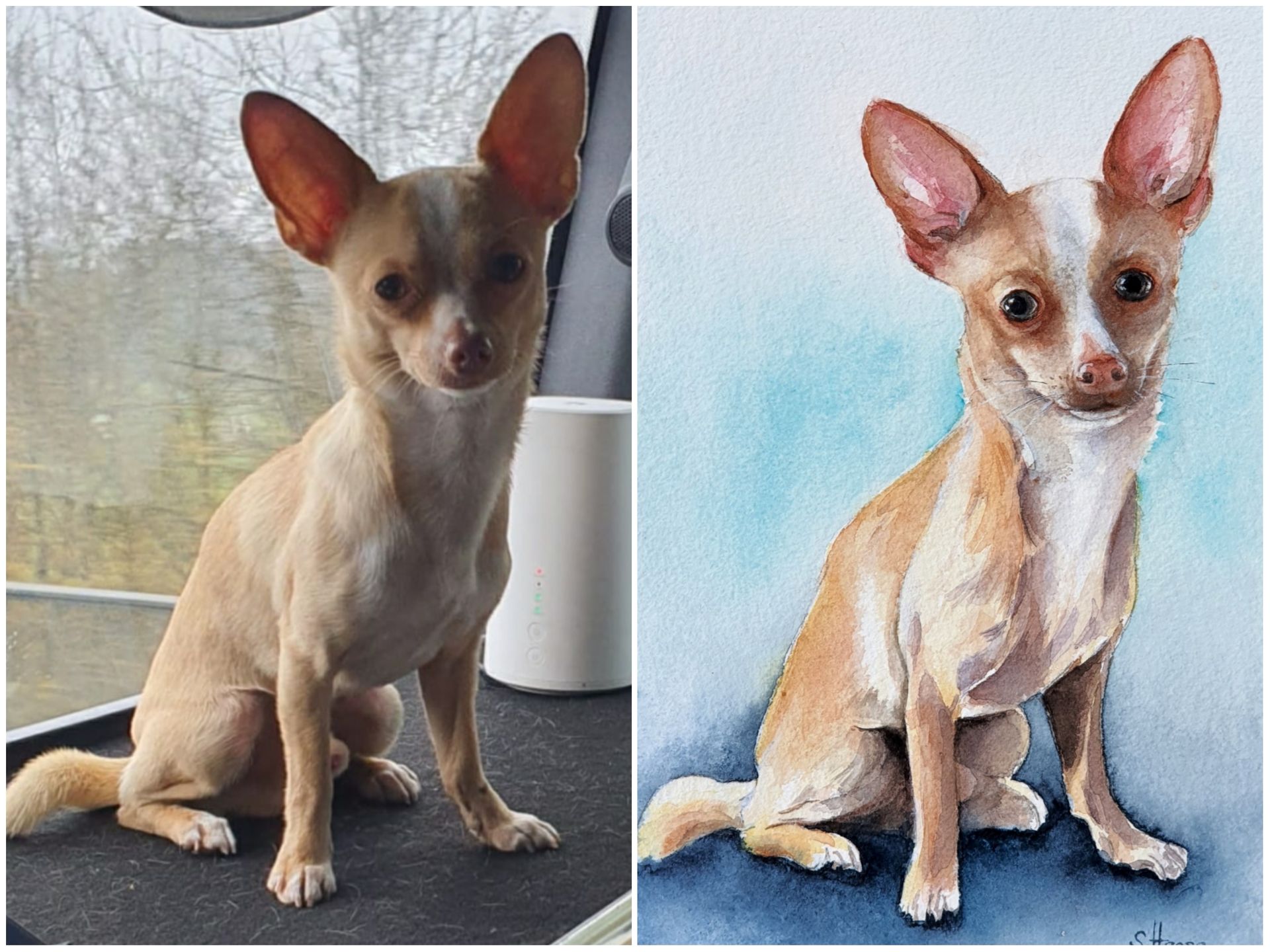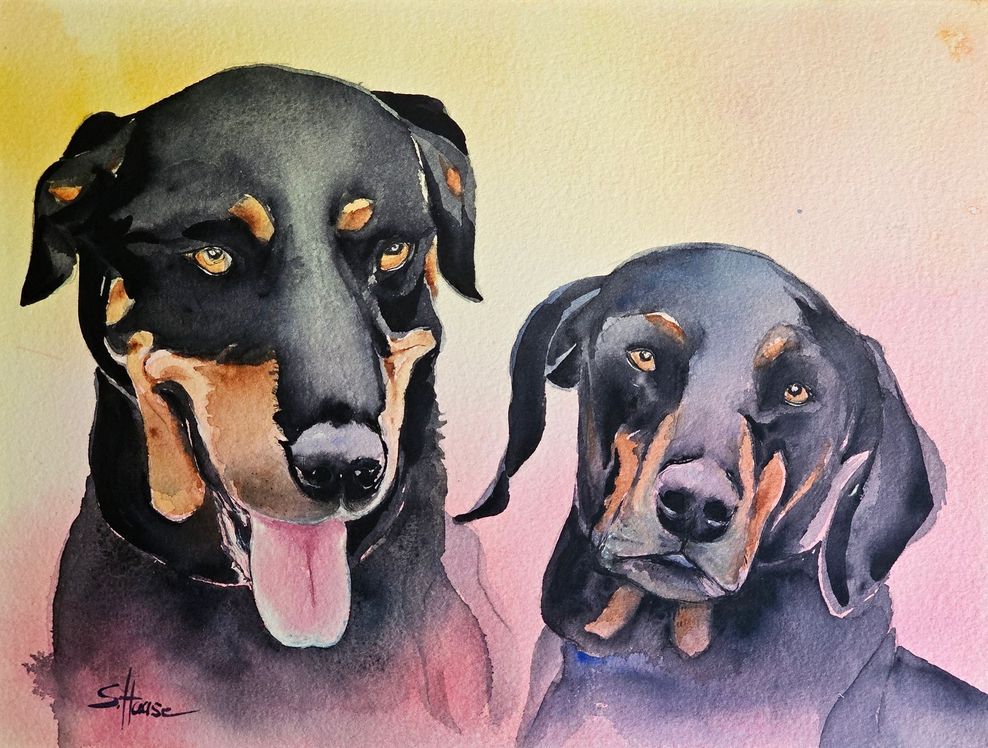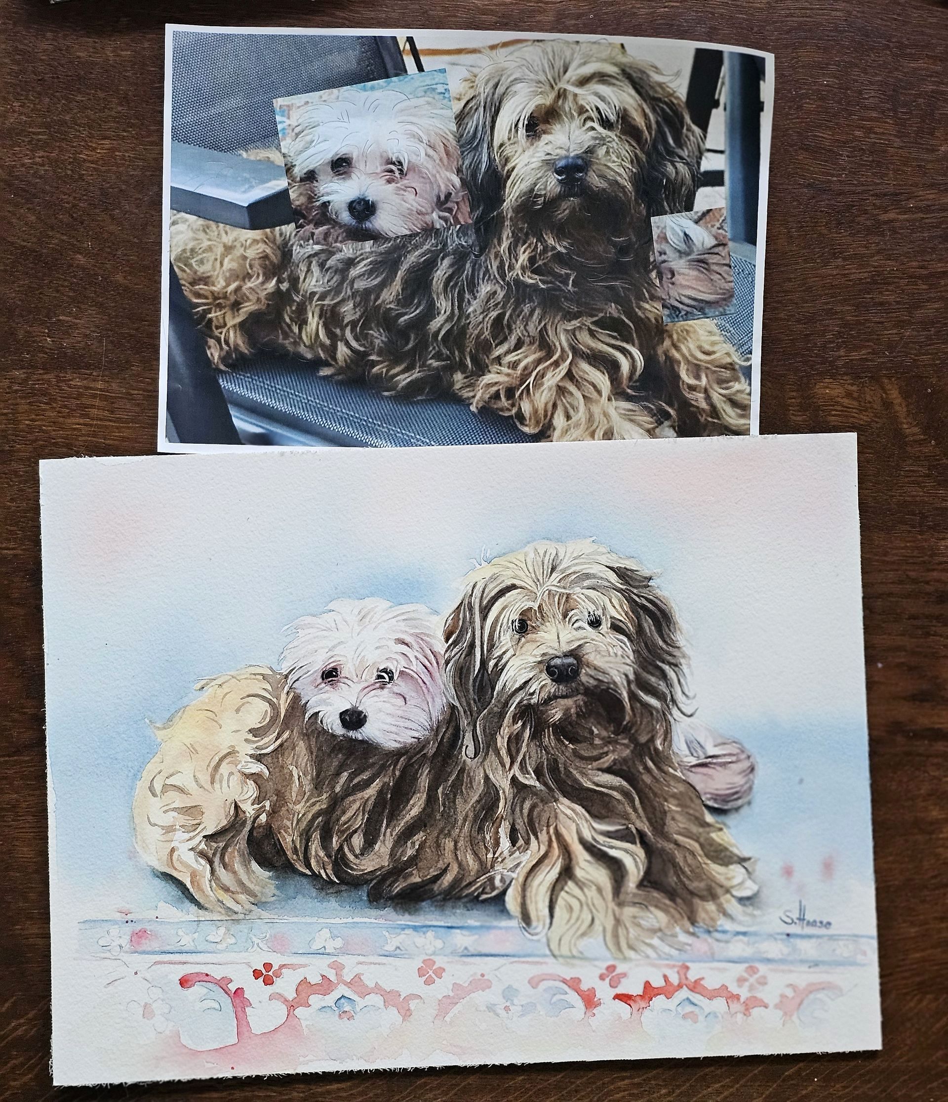 Dieser Auftrag war etwas ganz besonderes: Die Hundemutter starb leider bei der Geburt ihrer Welpen. Somit gab es keinen Moment oder ein Foto, den die beiden später gemeinsam erleben konnten. Doch in der Kunst ist vielmöglich. Ich habe beide Tiere zusammen gemalt und die Besitzer waren zu Tränen gerührt.