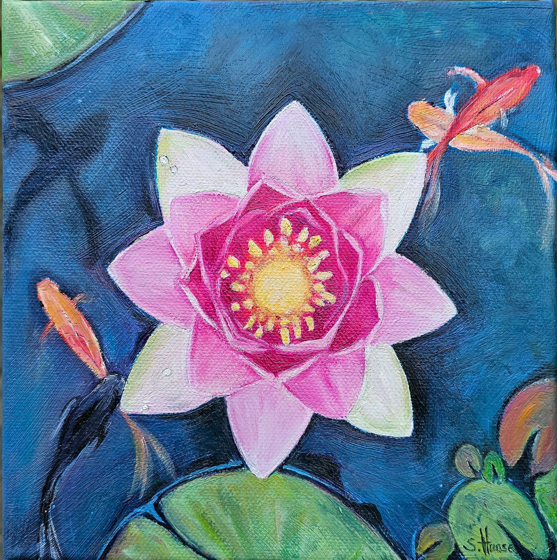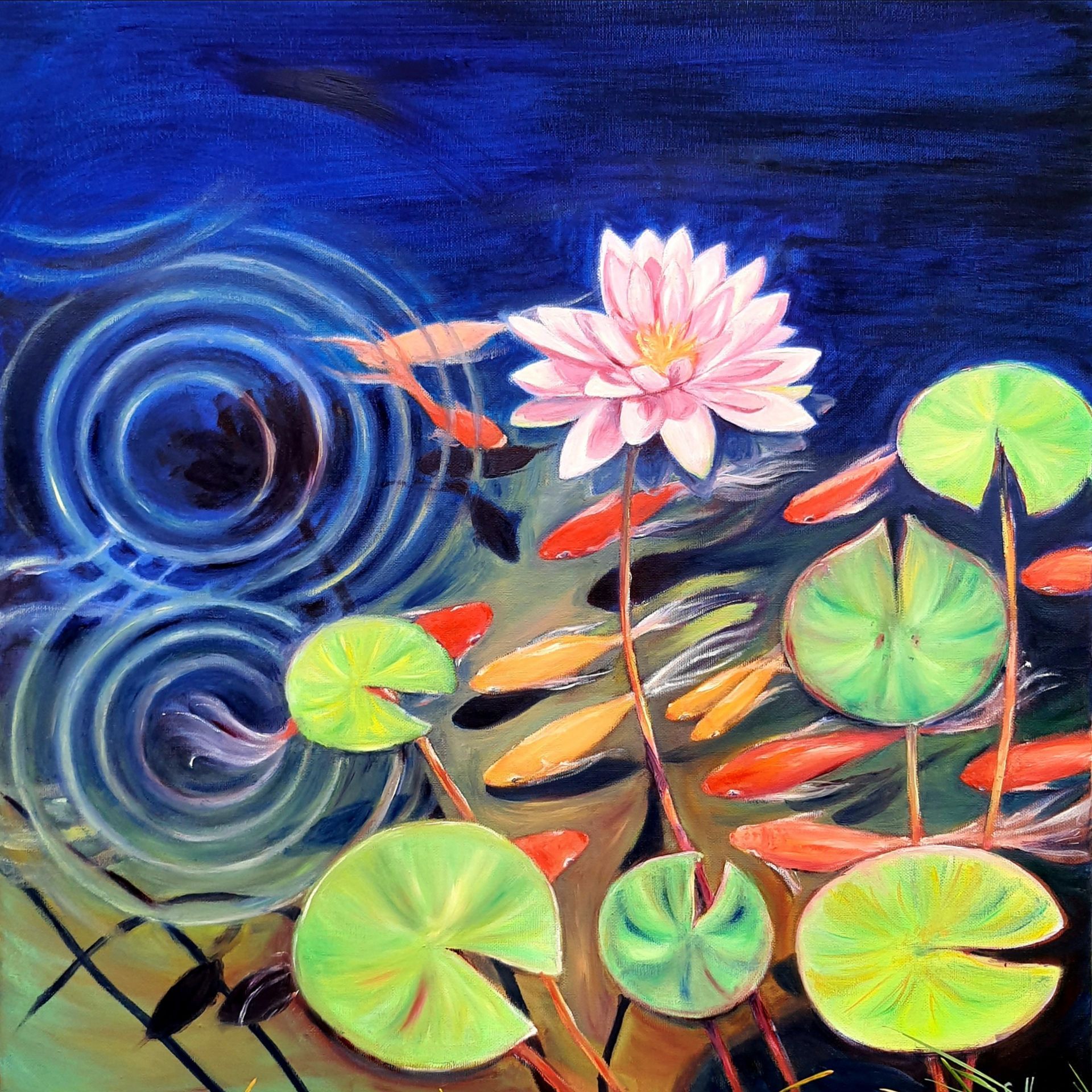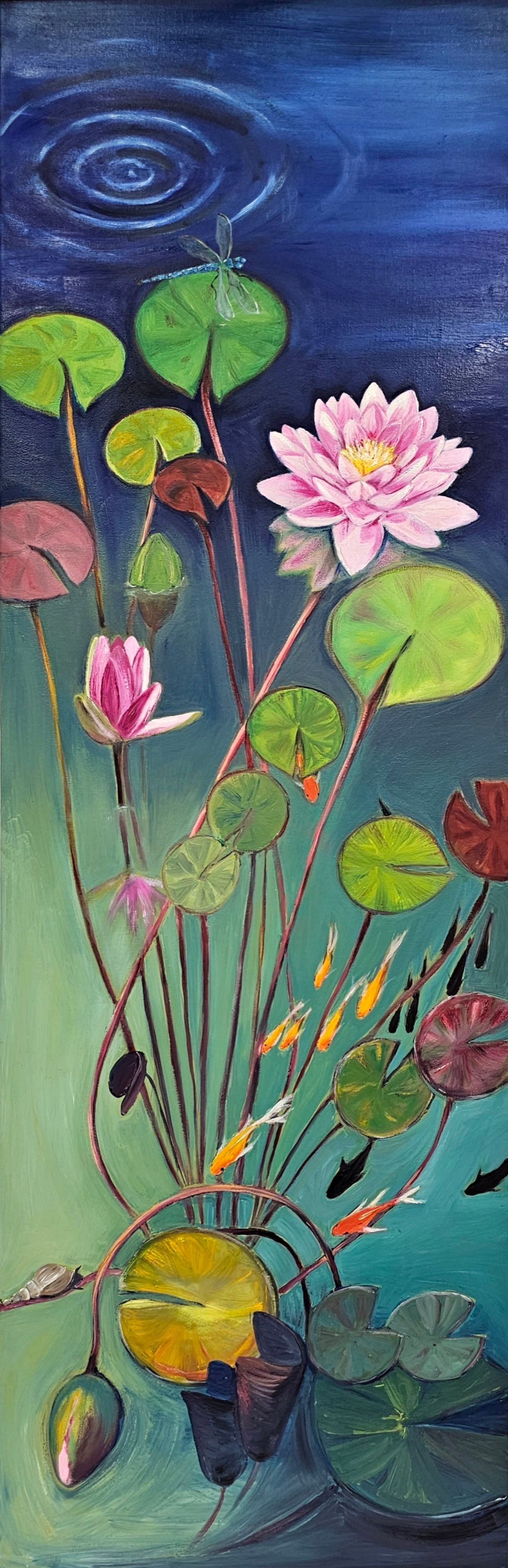 The ponds in my garden did magic to me. Full of excitement and joyful anticipation, I check on them every day. And there is always something new and beautiful to discover. A new blossom, a pretty insect, and recently, a whole swarm of small fish. The impressions are endless and fill me with a happiness that stays with me for a few minutes, even after I have left this magical place again. I capture some of these moments on paper or canvas. All motifs come from my own ponds.