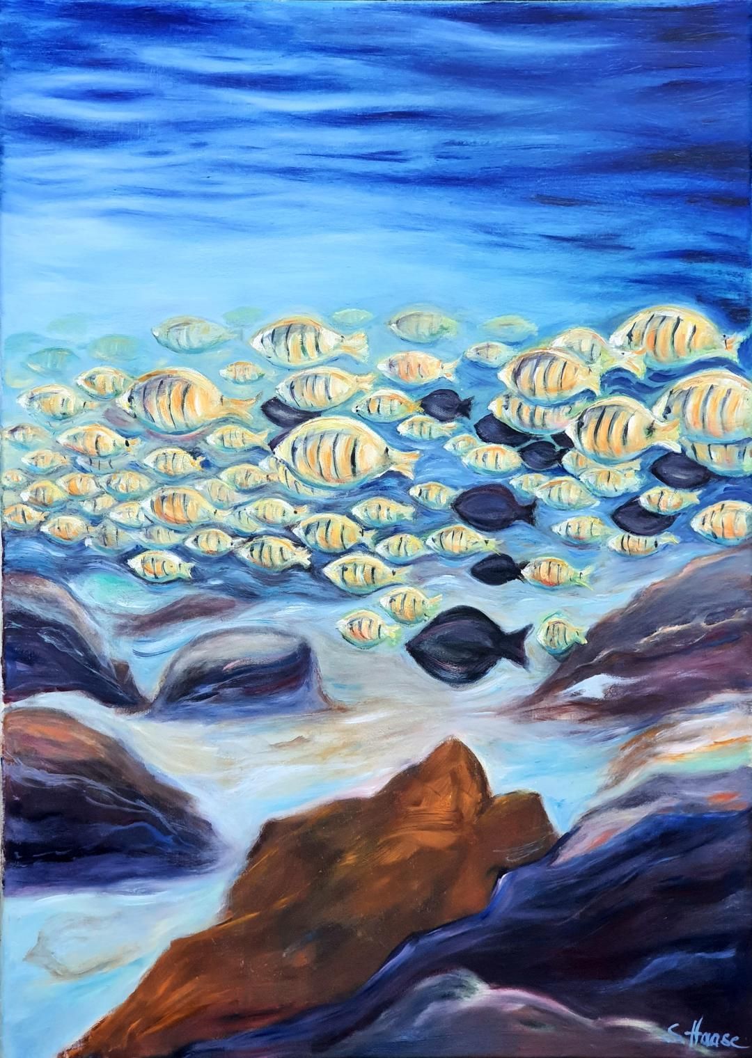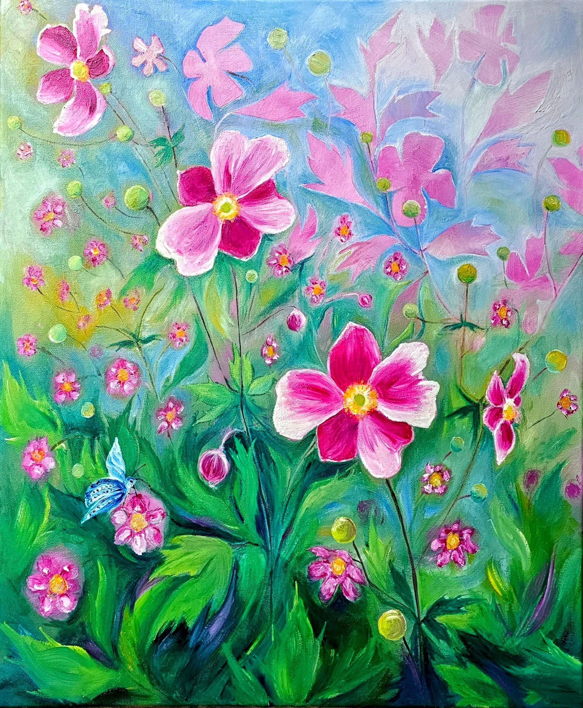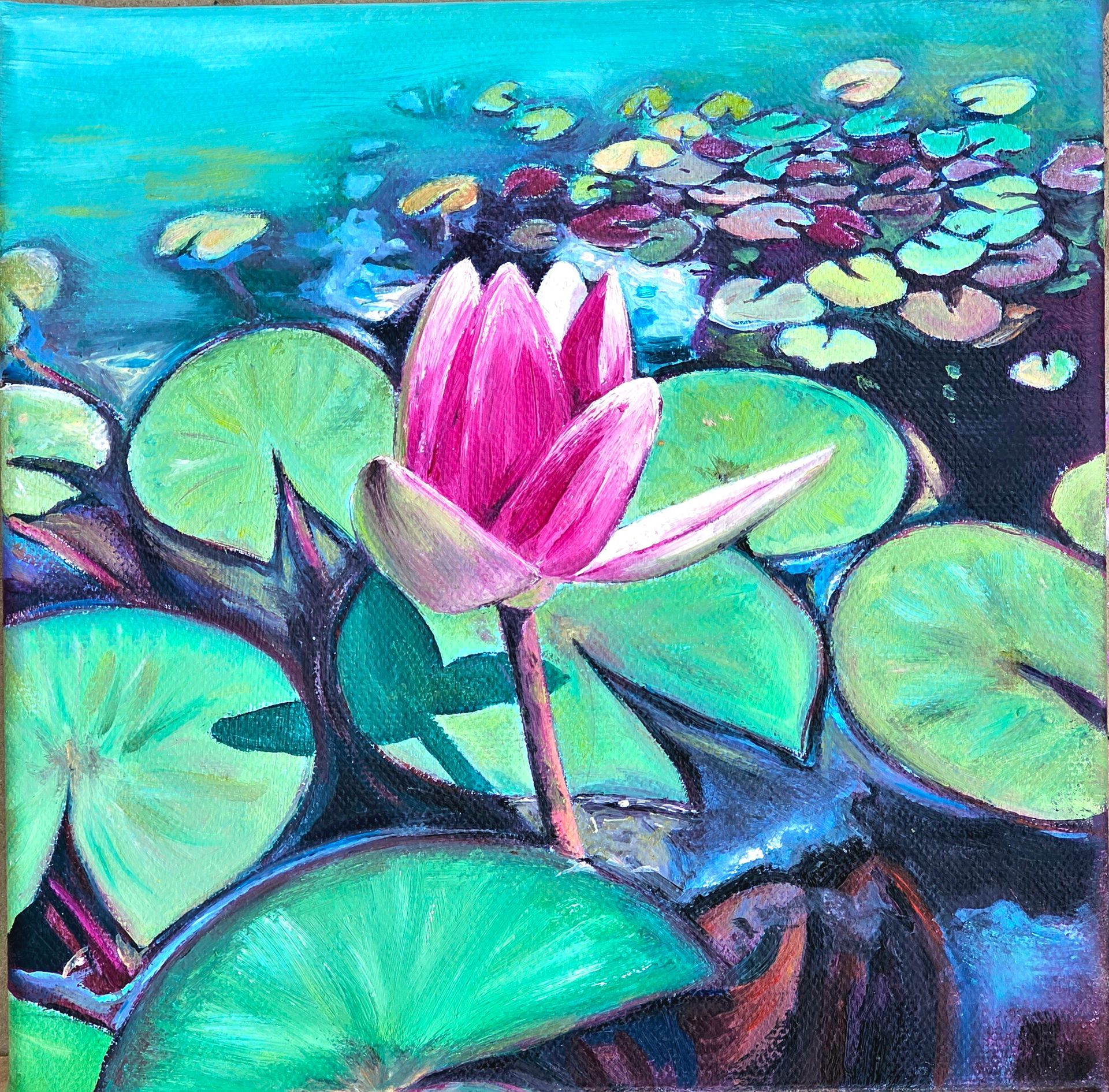 The ponds in my garden did magic to me. Full of excitement and joyful anticipation, I check on them every day. And there is always something new and beautiful to discover. A new blossom, a pretty insect, and recently, a whole swarm of small fish. The impressions are endless and fill me with a happiness that stays with me for a few minutes, even after I have left this magical place again. I capture some of these moments on paper or canvas. All motifs come from my own ponds.