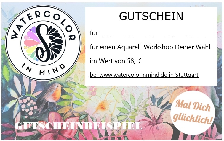Verschenke einen Aquarell-Workshop! Dieser Gutschein über 58€ gilt für einen meiner Workshops nach Wahl. Nach der Bezahlung verschicke ich den Gutschein per E-Mail.