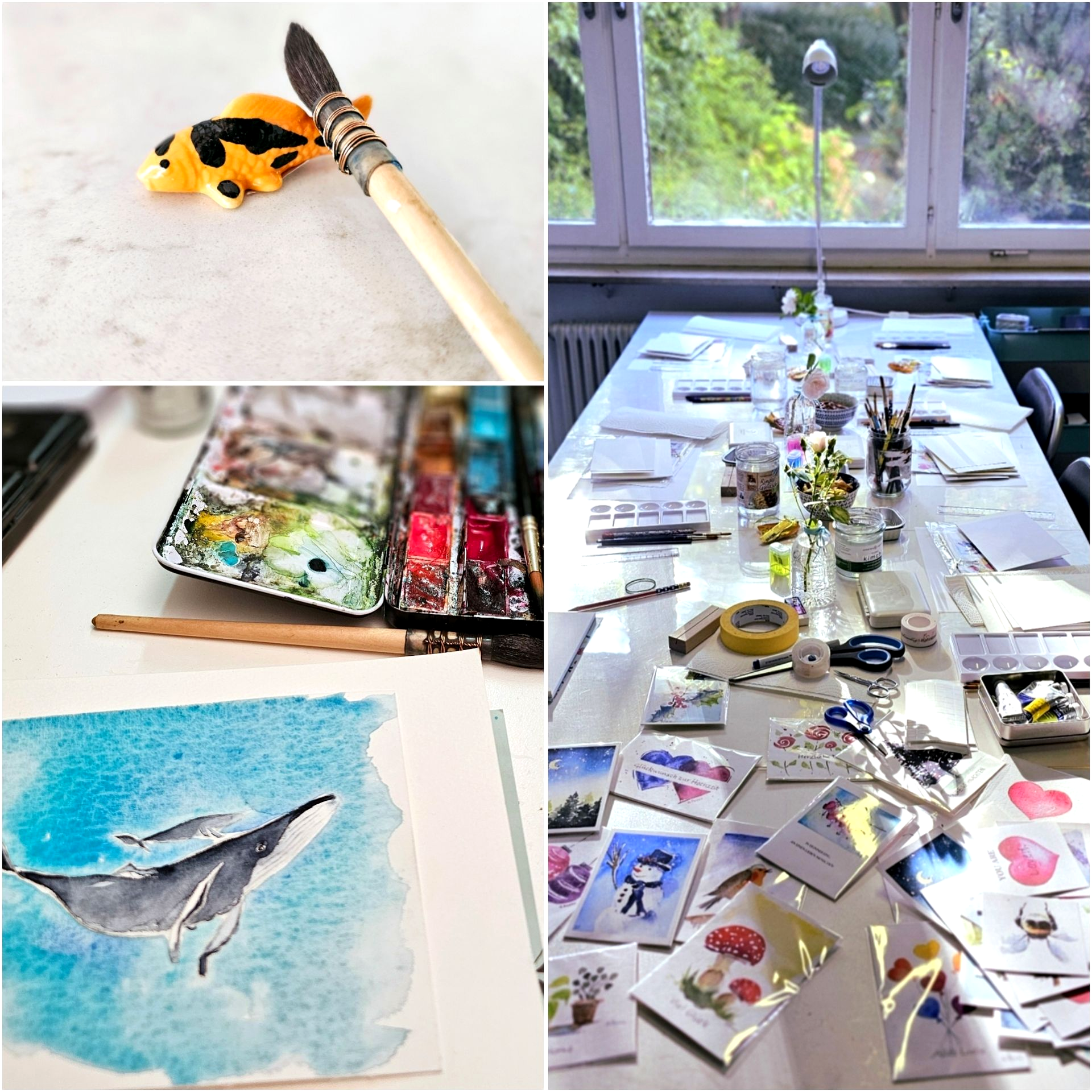 Each set of greeting cards includes hand-painted designs selected by me as high-quality art prints, printed on premium fineart paper with lighproven pigments. Each card is approximately 10.5 x 14 cm in size and blank on the inside. An order consists of 5 or 6 cards and 5 or 6 matching light brown envelopes. Each card is hand-signed by me. The small watercolor print can be framed by the recipient upon receipt, making it much more than just a card.